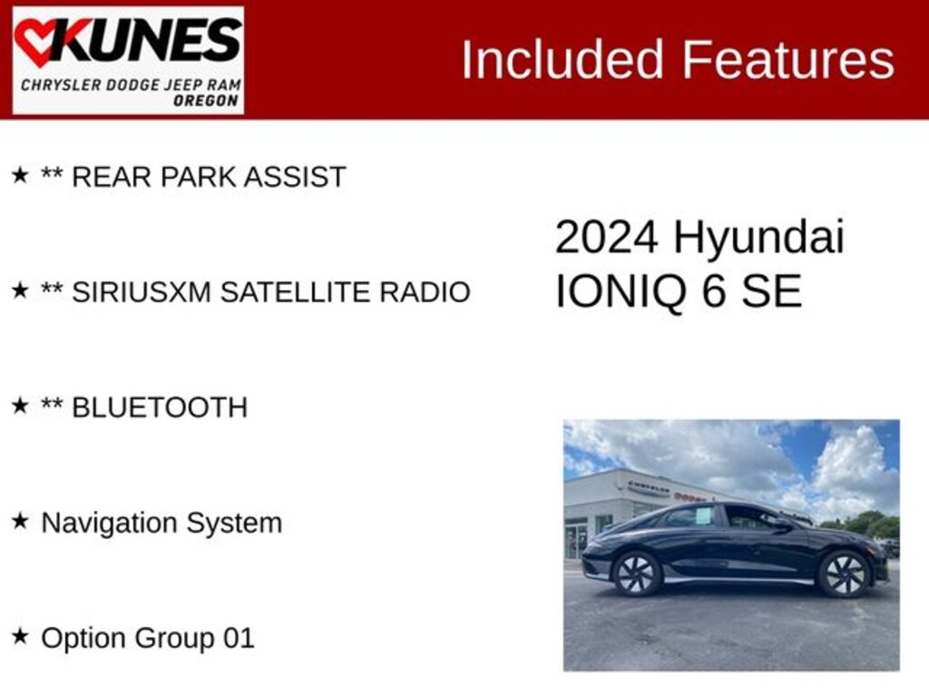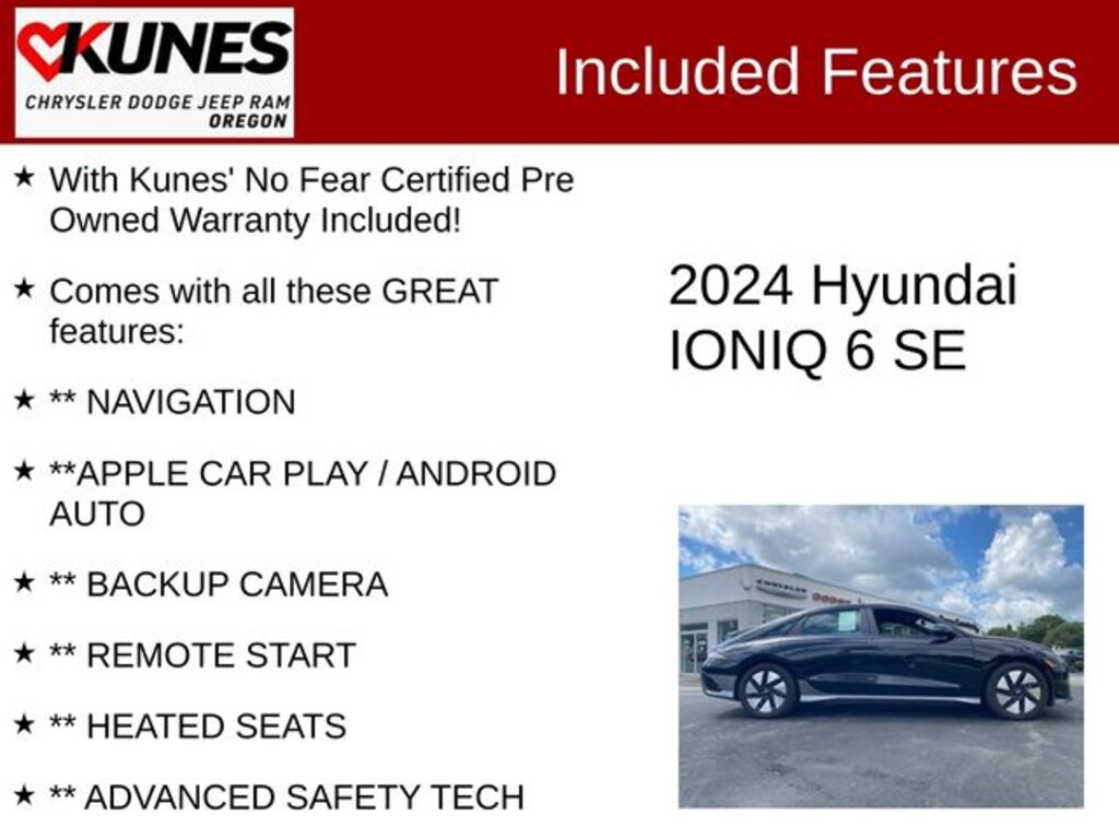 With Kunes' No Fear Certified Pre Owned Warranty Included!, Comes with all these GREAT features:, ** NAVIGATION, **APPLE CAR PLAY / ANDROID AUTO, ** BACKUP CAMERA, ** REMOTE START, ** HEATED SEATS, ** ADVANCED SAFETY TECH, ** REAR PARK ASSIST, ** SIRIUSXM SATELLITE RADIO, ** BLUETOOTH, IONIQ 6 SE, 4D Sedan, AWD, Onyx Black, Black w/Stain-Resistant Cloth Seating Surfaces, Navigation System, Option Group 01.